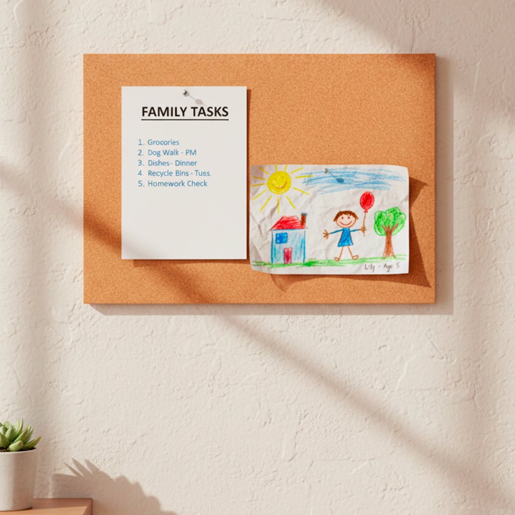 Povrch z pravého korku dodává nástěnce teplý a přirozený vzhled. Uvnitř se ale skrývá lehké a odolné pěnové jádro, díky kterému špendlíky snadno proniknou dovnitř, pevně drží a vpichy zůstávají nenápadné.